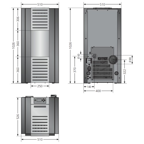 Dank des 80 mm Innendurchmesser Abgasrohrs, das von hinten an den Schornstein angeschlossen wird, gestaltet sich die Installation flexibel und unkompliziert. Die Möglichkeit einer externen Luftversorgung von hinten bietet zusätzliche Flexibilität bei der Aufstellung des Ofens.